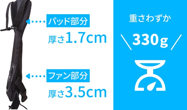 パッドに搭載した2つのファンが背中に直接風を送り込むので、夏場のリュック使用時の不快な蒸れを軽減し、快適なリュックライフが送れます。
