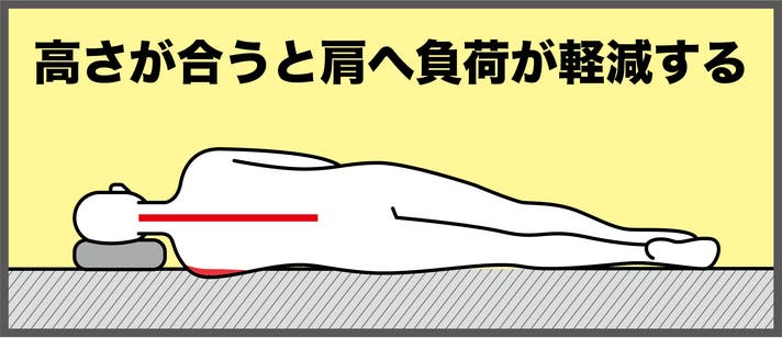 市販の枕は高さが10cm前後でも、実際に寝ると5〜7cmまで沈み込みがち。横向きで寝る場合は、首の角度が肩と垂直に並ぶように保つのがいいとされています。