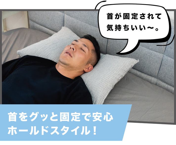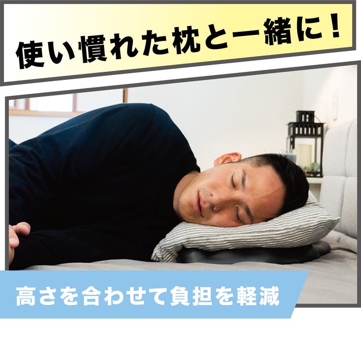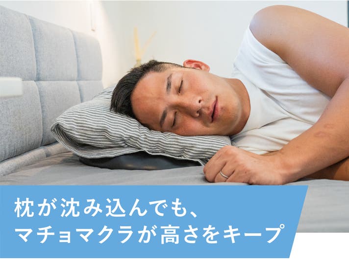 マチョマクラ with補助を下に敷けば、頭の重さを下から支えて枕の沈みを補正。理想的な高さをキープして、首・頭を安定させ、寝返りもスムーズに行えます。