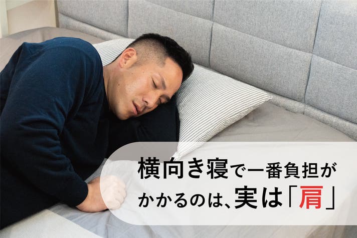 横向き寝のときに一番負担がかかるのは、実は「肩」。通常の枕では横向きで寝た際に頭の重さが肩にのしかかり圧迫され、肩への不快感につながります。