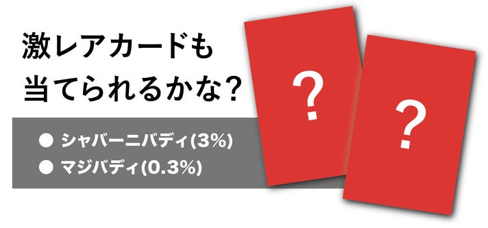 ●バディ(コモン)60%●リアライティブバディ(アンコモン)25%●ブライトフォース(レア)12%●シャバーニバディ(スーパーレア)3% ●マジバディ(プレミアシークレット)0.3%