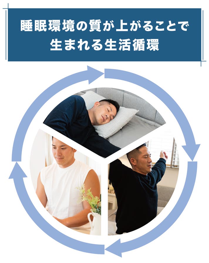 夜のリラックスタイムが、朝や日中の快適な時間へとつながるイメージ。そんなリズムを支えてくれるマチョマクラ with補助で清々しい朝を迎えましょう!