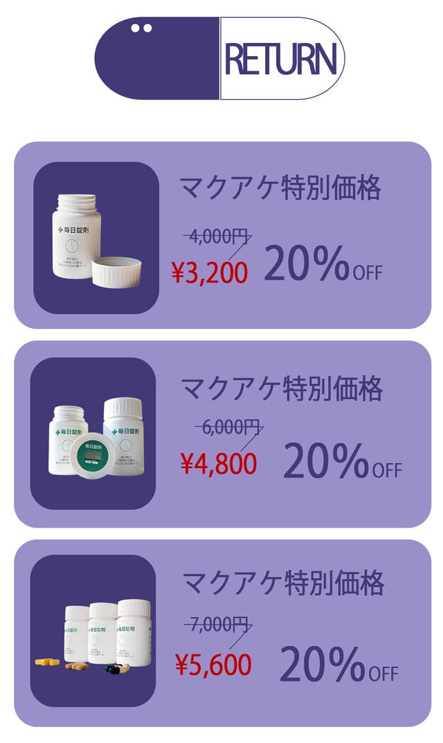 マクアケ特典ダブル割20%OFF 毎日錠剤2個