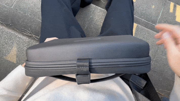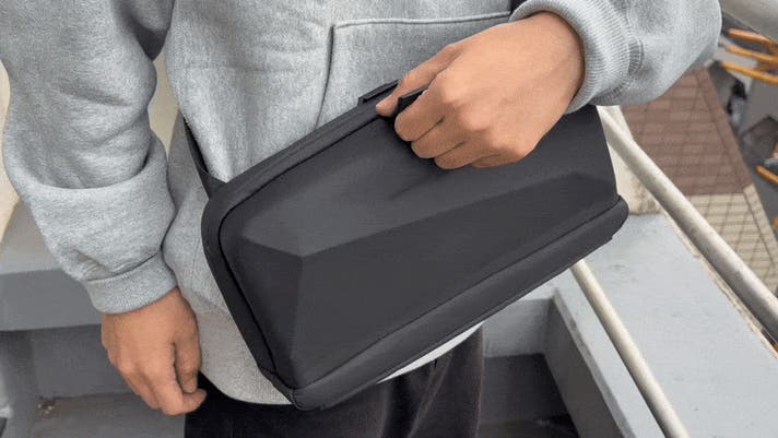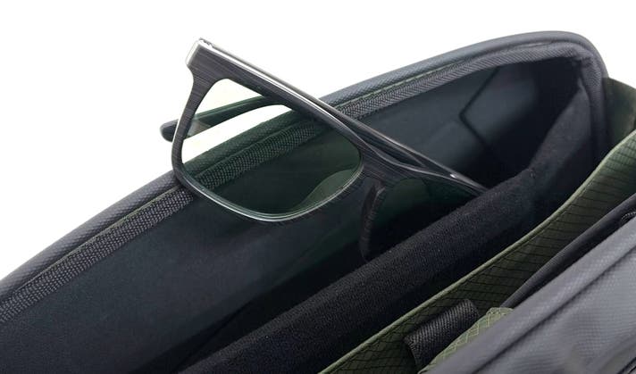 【衝撃吸収】厚みのあるパッド入り間仕切りと、EVAのハードシェルスペースがあれば、サングラスや眼鏡もつぶさずに収納できます。