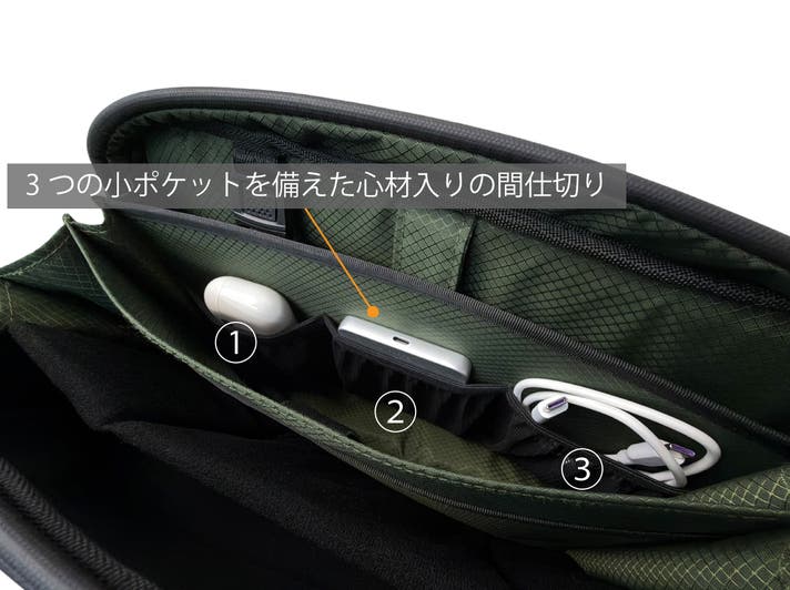 スマートフォンやイヤホン、モバイルバッテリーなどのガジェット類は用途にあった間仕切りが保護します。