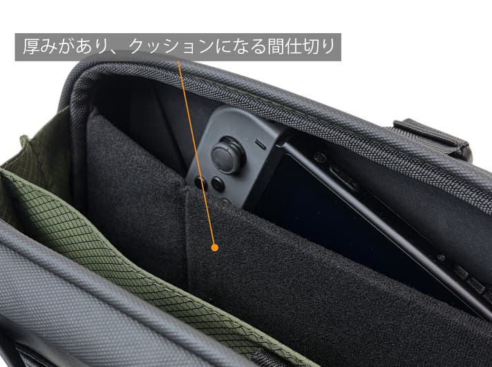 ポータブルゲーム機やサングラスは厚みのあるパデッド間仕切りで保護できます。