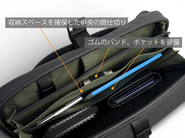 中央の間仕切りにはゴムで伸縮するループとポケットがついています。