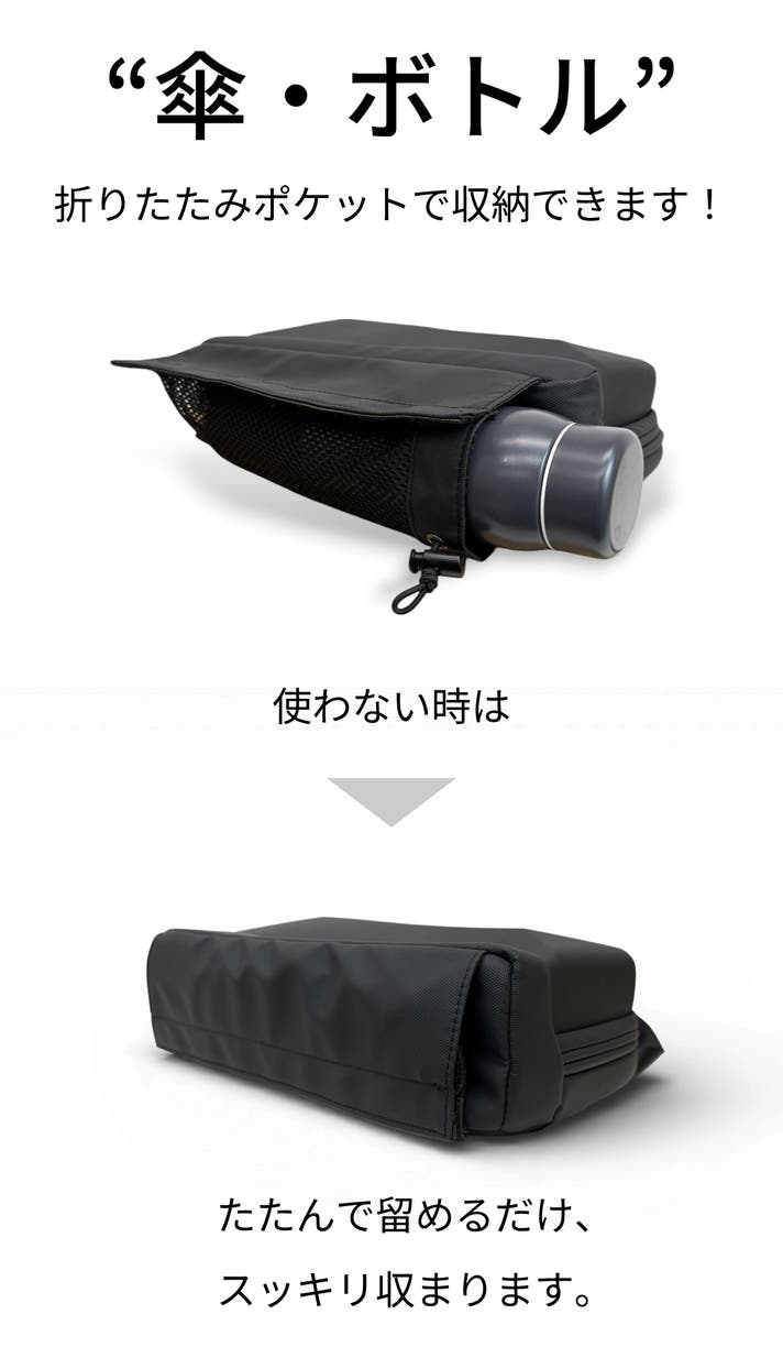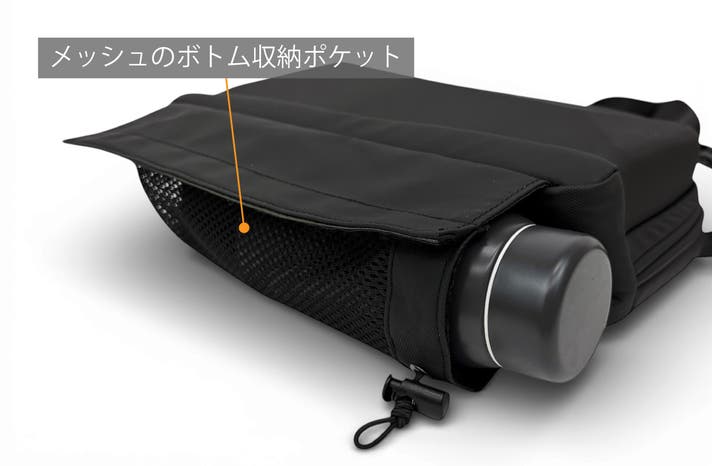 底面にあるボトムポケットは折り畳み傘や水筒、ペットボトルなどの収納が可能です。