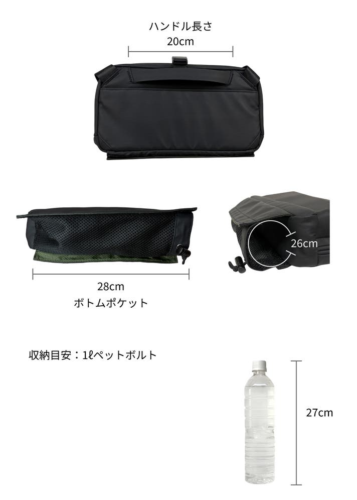 水筒や1リットルペットボトルの持ち運びも可能です。