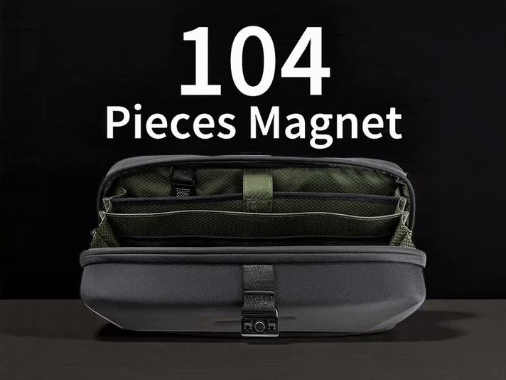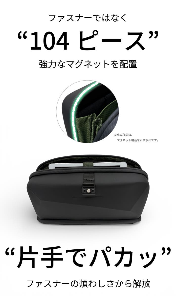 バッグの開閉はクイックでスムースかつ、しっかりとロックさせるために、専用のマグネットを設計しました。独自構造で104個のマグネットを配置しています。