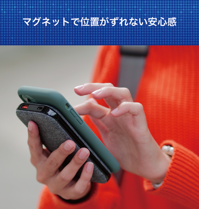 今までのワイヤレス充電では、ちょっとした拍子に位置がずれて充電できていなかったということがあるのではないでしょうか。そういう経験があると、ずれていない時でも「大丈夫かな?」なんて心配になっていちいち様子を見てしまうことも。でも【 MagCharger 】ならiPhoneの背面に磁力でピタッと張り付くので位置がずれる心配がありません。