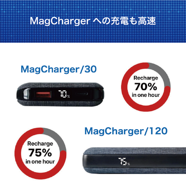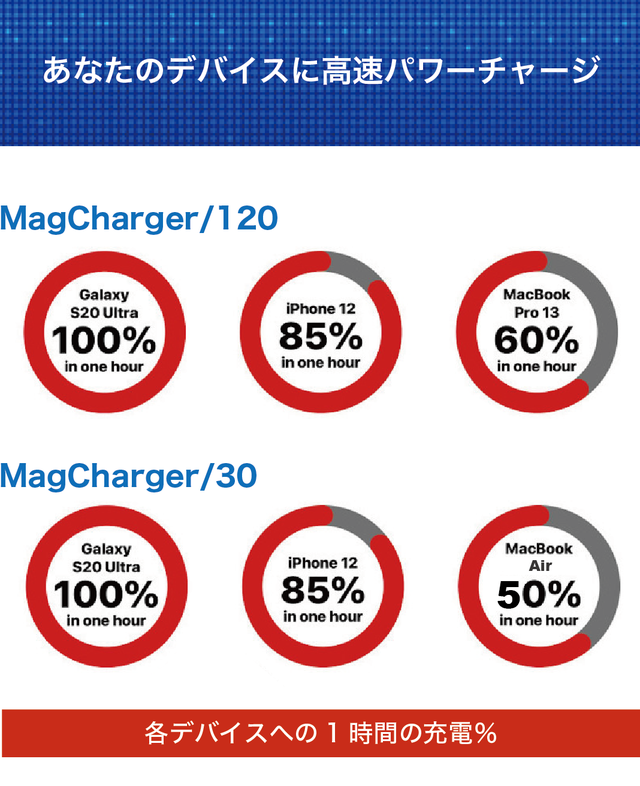 【 MagCharger 】はデバイスを高速に充電するのはもちろん、本体自体も速く充電できます。【 MagCharger 30 】はわずか1時間で70%、 【 MagCharger 120 】は1時間で75%を充電できます。