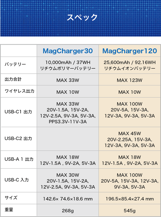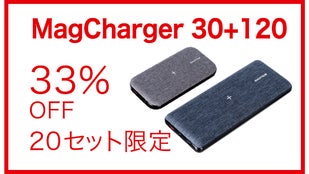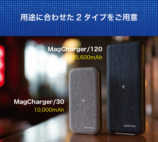 軽量コンパクトな【 MagCharger 30 】と、さらに容量の多い【 MagCharger 120 】の2タイプをご用意しました。iPhone12の容量は2,775mAhですので、コンパクトな【 MagCharger 30 】でも3回以上フル充電ができます。もし外出先でiPadやノートPCなどを何度も充電したい場合は大容量の【 MagCharger 120 】がおすすめです。