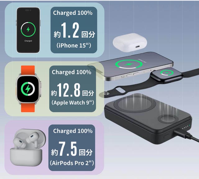 iPhone15を約1.2回、Apple Watch 9を約12.8回、AirPods Pro 2を約7.5回と、日常利用にも十分に対応が可能です。