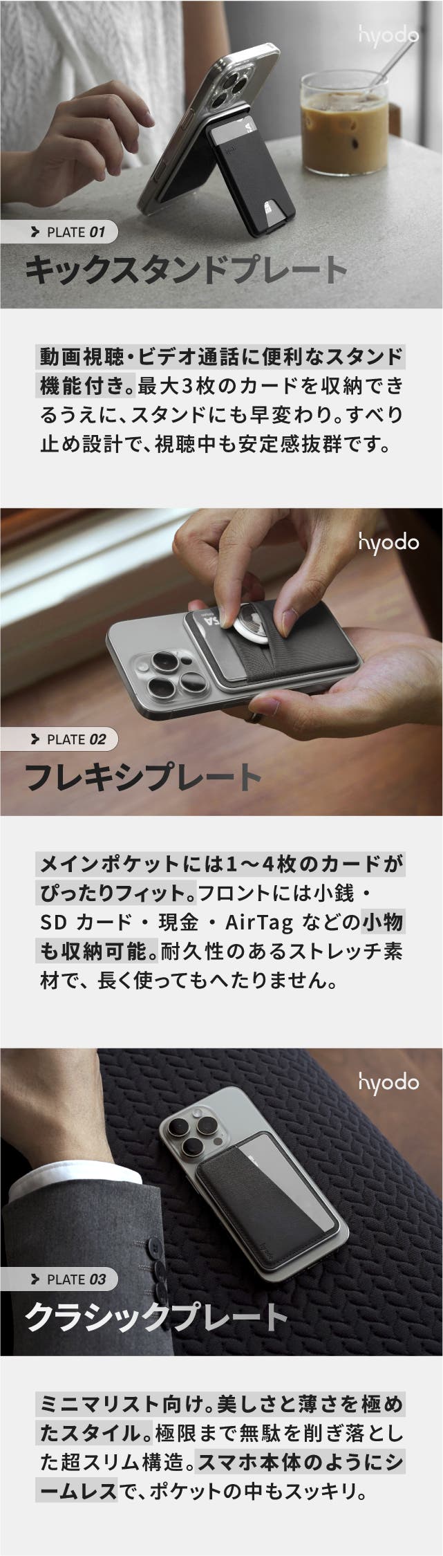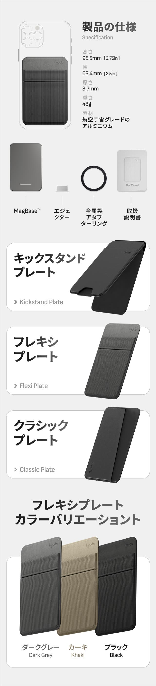 MagBase™は、用途や好みに合わせて選べる3つのプレートをラインナップ。あなたのライフスタイルにぴったりフィットするスマートな使い方が可能です。