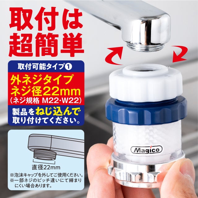 ・洗濯機にマジバブルを取付ける際には、ゆっくり、元のホースのネジが締まっていた程度の硬さで締め付けてください。早く、強く締め過ぎると、ネジの破損などにより、水が漏れる原因になります。