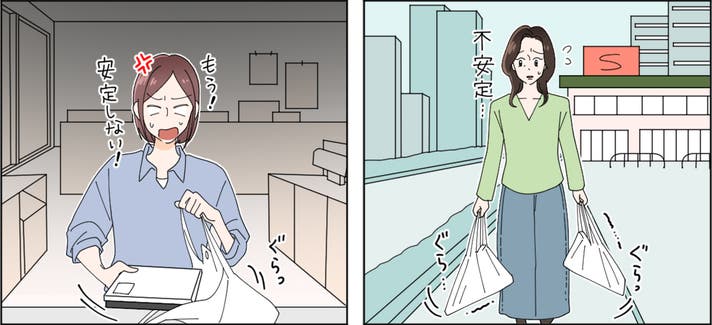 A. はい、設計上、バッグが水平を保ちやすく、重心が安定するようになっています。自転車の前カゴや後部スペース、車の足元・トランクなどでも使いやすくなっています。