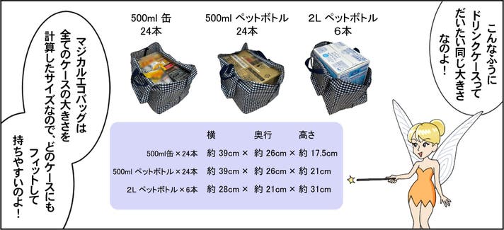 その時、購入した箱売りのドリンクを『自転車で持って帰る時』、『支払い後店舗の駐車場に運ぶ時』、『マンションの駐車場などから自室まで運ぶ時』、これらのシーンで使えるような大きさのエコバックがあれば便利なのに、と漠然と思いました。