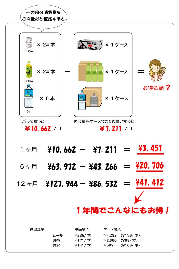 ビール・お茶・炭酸水の箱買いするとこれだけお得に!!(都内量販店にて当社調べ)