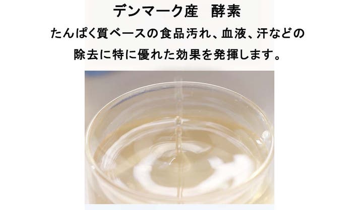 【液成分】精製水、プロピレングリコール、界面活性剤(アルコールエトキシレート、PEG-40水添ヒマシ油、コカミドメチルMEA)、防腐剤(ベンザルコニウムクロリド、IPBC)、酵素(プロテアーゼ)、レモンオイル など