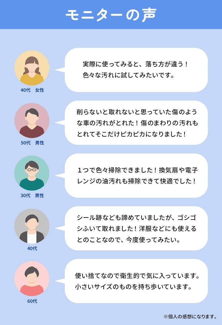 マジックテイッシュだけでしっかり汚れが落ち、お掃除ができるので洗剤も、スポンジも、バケツも、ブラシなども、準備しなくてOK!!