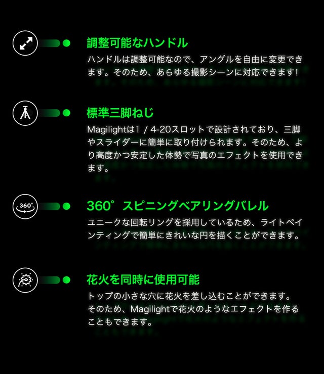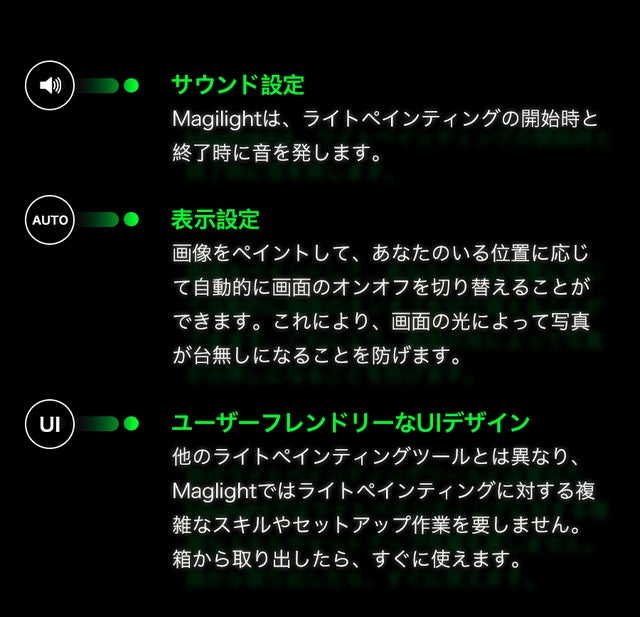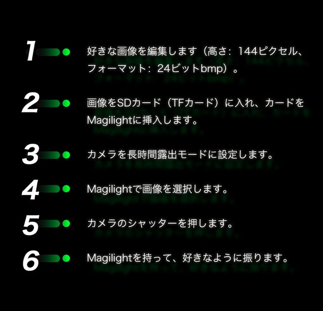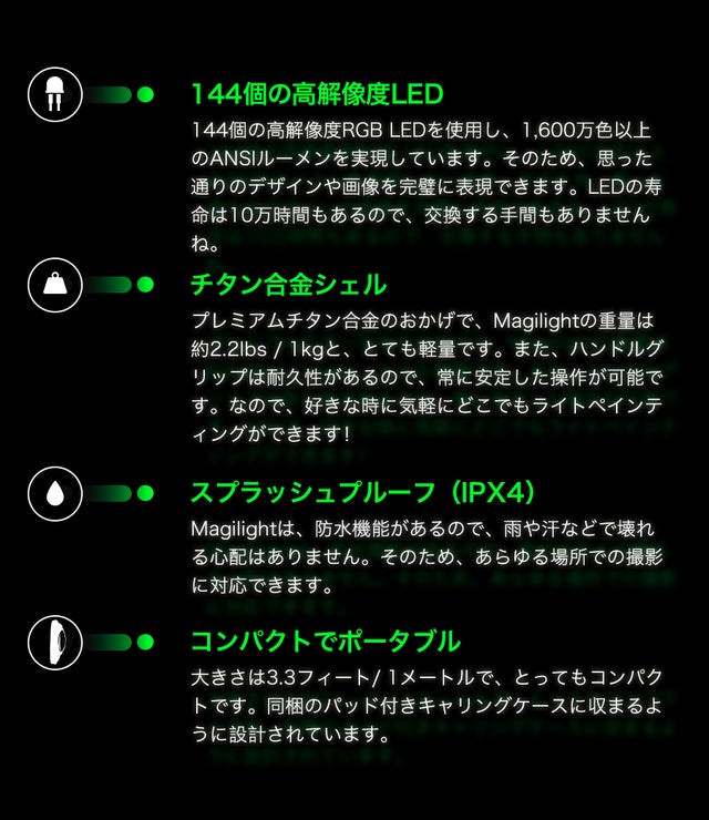そこで、オールインワンのライトペインティングスティック「Magilight(マギーライト)」を製作することとなりました。Magilightは、ライトペインティング写真を簡単かつプロフェッショナルに撮るのに最適なツールです。素晴らしいナイトスナップを創作したり、オリジナルデザイン・アニメーション・様々な光の背景を簡単に表現できます。