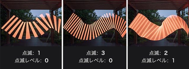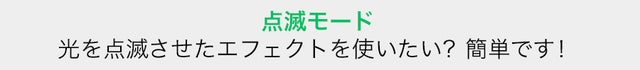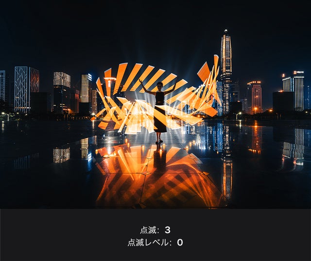 「点滅」モードでは、光を点滅させたエフェクトを簡単に作り出すことができます。「点滅」の値を調整することにより、フリッカーの周波数を制御することができます。「点滅レベル」の値を調整することで、点滅の際の明るさをコントロールすることができます。