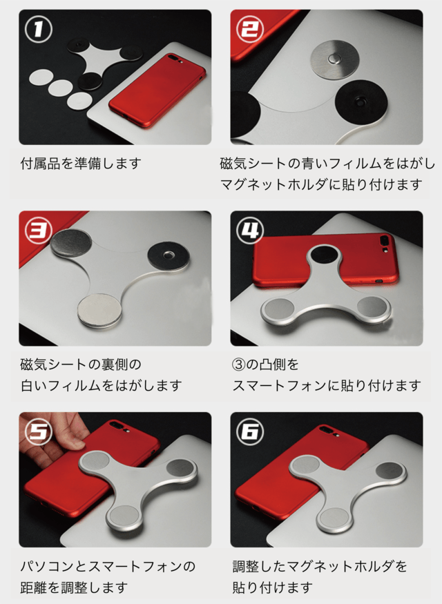 ※磁気シートと電子機器の間に貼り付ける透明なシートが付属します。直接電子機器に取り付けたくない方は、この透明シートを先に貼ってから使用してください。取り外す際は、取り外し用つまみから剥がすようにしてください。