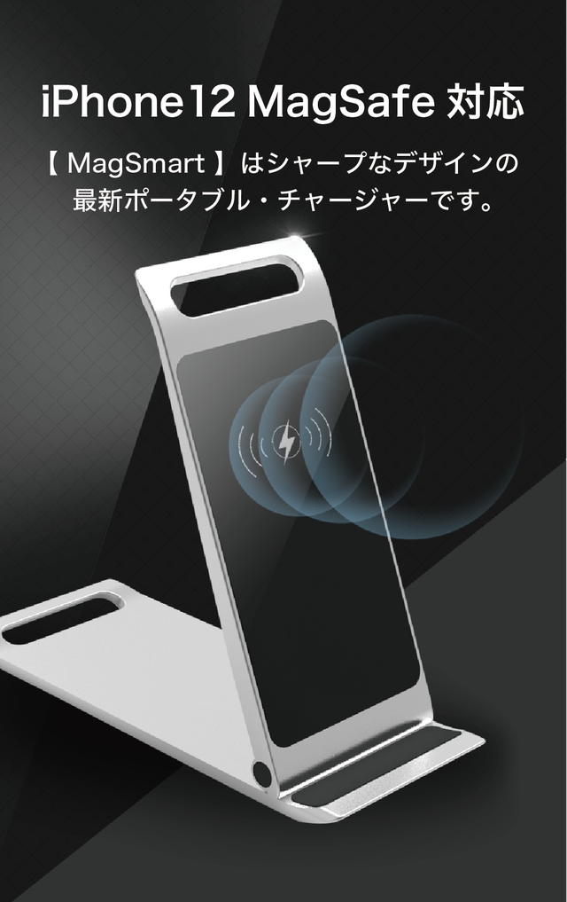 【 MagSmart 】はiPhone12シリーズに新しく導入された「MagSafe機構」に対応するワイヤレスチャージャー。最大15W出力であなたのスマホを快適に充電します。