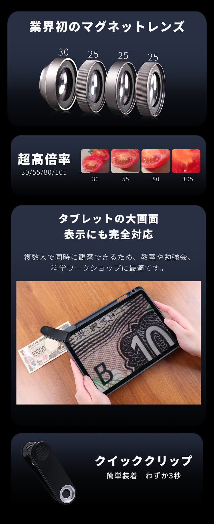 - スマホが一瞬で顕微鏡に!最大105倍拡大で、見えない世界が鮮明に広がる新体験。