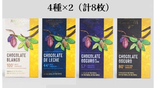 ホワイトチョコレート、44%ミルクチョコレート、57%ダークミルクチョコレート、80%ダークエクストラチョコレートの全種4枚セット×2(計8枚)