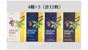 ホワイトチョコレート、44%ミルクチョコレート、57%ダークミルクチョコレート、80%ダークエクストラチョコレートの全種4枚セット×3(計12枚)