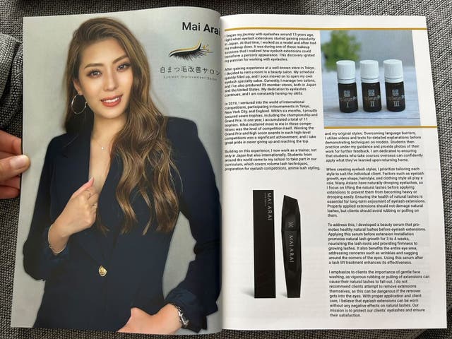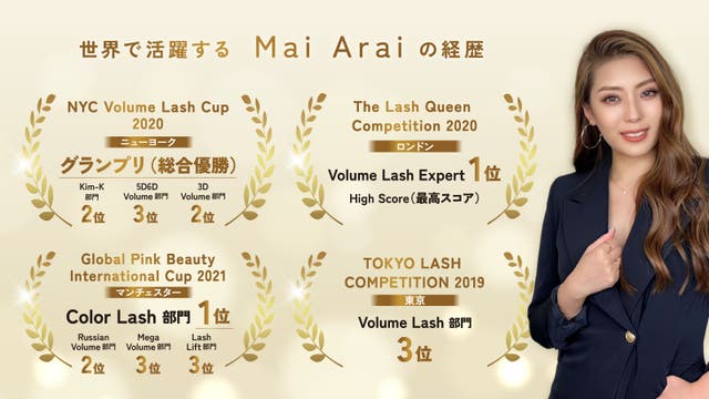 まつ毛エクステの国際大会( ニューヨーク、ロンドン、マンチェスターなど)で優勝やグランプリなど合計11個ものトロフィーを獲得し、世界で活躍する現役ラッシュアーティストで、まつ毛オタクのMAI ARAI。