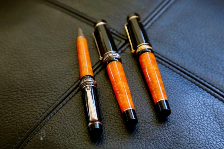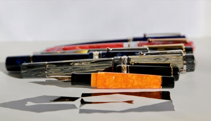 そして、その興奮も冷めやらぬなか、1998年に発表したDVコレクションで当時の万年筆愛好家を驚かせたのは、コロッセウムから引き継いだオレンジとブランクの色使いだもさることながら、通常のミディアム・サイズではなく、ミニ・サイズからコレクションを始めたことでした。当時の筆記具業界からしたらミニ・サイズは珍しく、そのチャーミングで愛らしいスタイルは、世界中の万年筆愛好家を虜にし、イタリアを代表するトップ・ブランドの一角を担う存在になりました。