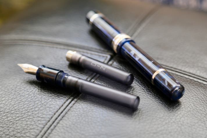 前作からの"進化”は、素材を金属製から樹脂製に変更。インク・タンクの「軽量化」とインクの残量が可視化できる「サンド・ブラスト仕様」にしたことで、グッと実用性が高まりました。一般的に普及している ヨーロッパ規格のカートリッジインクの容量は約0.7~0.8mlほど。D-Nのインク・タンクの容量は2mlということなので約3倍のインクを持ち運べることになります。胴軸内に1本。そして付属にもう1本、計2本のインク・タンクが同梱されています。