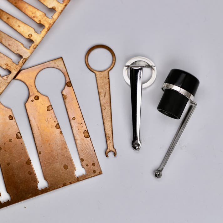 D-Nのもう1つの特徴に、ローリング・ホイールを採用したクリップがあります。古典的な意匠のクリップは、上着のポケットの生地を傷めないような仕組になっています。真鍮製の板を、ベースの形にカットしていく作業にも手間と時間を惜しみなく費やしています。