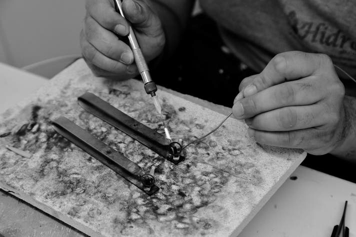 そこから手作業で凹凸をつけ、強度を高めながら専用の器具を使って付け根を折り曲げ、ホイールの部分を両端からペンチで挟んで仕上げていきます。細部にもD-Nならではのこだわりがあります。
