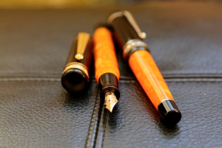 南イタリアの太陽光を表現した鮮やかなオレンジとブラックのコントラストが特徴的なDVオリジナル・ミニ万年筆。今回の注目はなんといってもバーメイル・バージョンです。