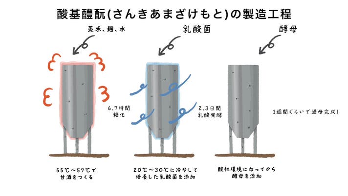 「米の恩返し」の最初のチャレンジでは「酸基醴酛(さんきあまざけもと)」という製法を採用しています。