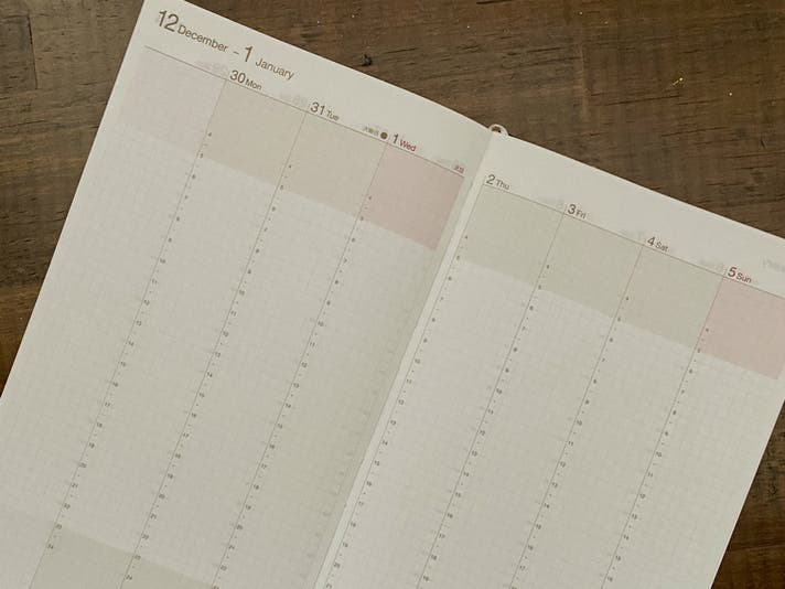 バーチカルタイプで、1日の流れや余白を直感的に把握できます。見開きで一週間の状態を理解します。