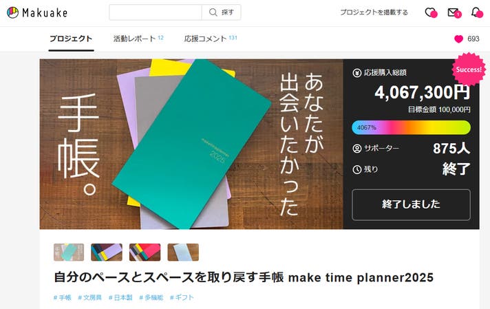 「Makuake(マクアケ)」は、実行者の想いを応援購入によって実現するアタラシイものやサービスのプラットフォームです。このページは、 プロダクトカテゴリの 「書いて整え、わたし時間の軸を育てる手帳make time planner2026」プロジェクト詳細ページです。