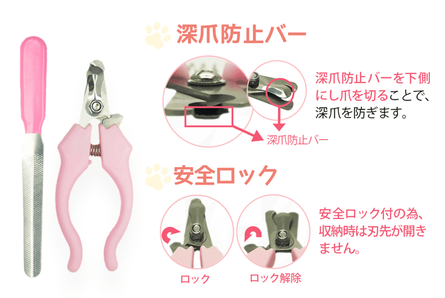ハサミ感覚で切れるニッパータイプの爪切り( 深爪防止バー&安全ロック付 ) と、爪切り後の仕上げとして爪を滑らかに整える爪やすりがセット。爪切りが慣れていない方でも、微調整しながら優しく爪切りが行えます。