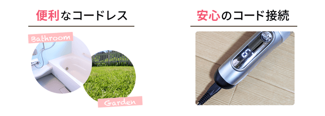 お風呂場やお庭など、コンセントがない場所はコードレスで!充電をし忘れた場合や、コードレスでパワーが落ちてきた場合などは、コードを使いコンセントからお使い頂けます。