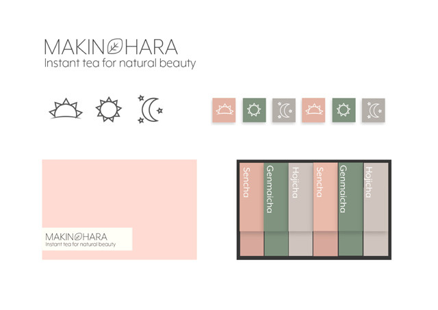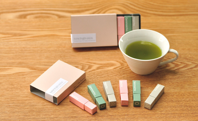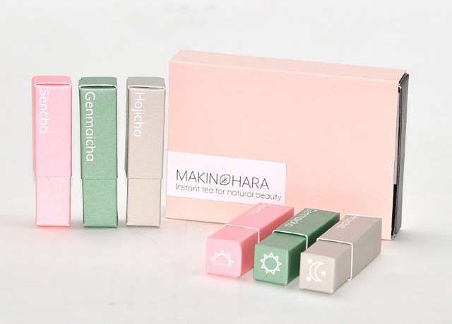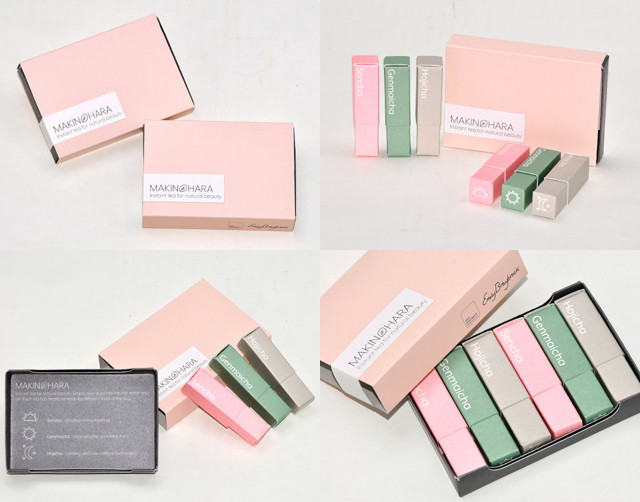 これまでの日本茶パッケージのイメージとは全く違う、イギリス人によるデザインに、茶舗 牧ノ原の3種類のパウダー茶をパッケージ。