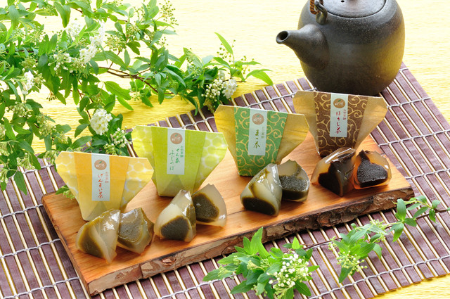 茶舗 牧ノ原の深蒸し茶「藤壷」、京都宇治の「抹茶」、厳選した「ほうじ茶」「玄米茶」を餡に練りこみ、吉野本葛で、やさしく仕上げました。