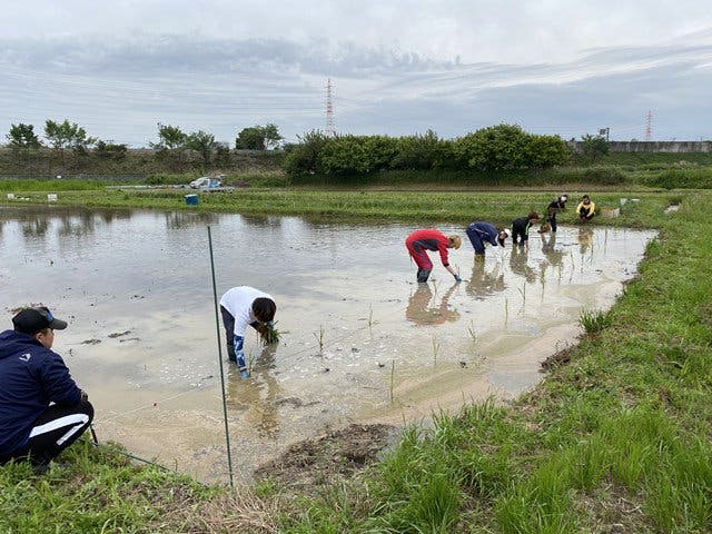 ↑田んぼに何度も足をとられながらも一生懸命マコモの定植を行いました
