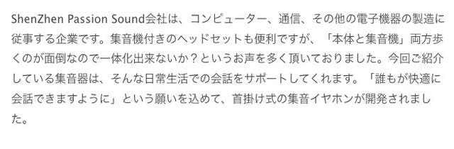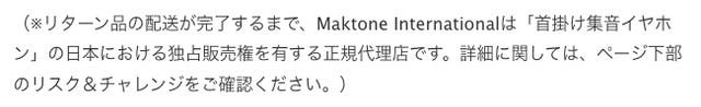 ※並行輸入品が発生する可能性があります。正規以外での個人輸入等は、完全に防ぐことができない場合がございます旨、予めご了承のほどお願いいたします。 ※並行輸入品は正規代理店による製品保証を受けることができません。また、正規代理店を通じて購入することで、日本国内での流通に必要な各種認証の取得や、関税の適切な処理が担保されます。 *使用感などに関しては、感じ方に個人差が予想される製品でございます。そのため、使用感等に関する返品・返金はお受けいたしかねます。 *初期不良以外に関する返品・返金は大変恐れ入りますがお受けいたしかねます。 *デザイン・カラー・素材などの仕様が一部変更になる可能性がございます。 *モニター環境によって、画像の色が実物と異なって見える場合がございます。 ※応援購入の数が想定を上回った場合、製造工程上の都合等により出荷時期が遅れる場合がございます。 ※皆様から想定を上回る応援購入を頂き、量産体制を更に充実させることができた場合、一般販売価格が予定価格を下回る可能性がございます。 ※本文中に記載させていただいたスケジュールは、あくまでプロジェクト公開時点の予定です。応援購入の性質上、配送遅延のおそれがございます。 原則として、配送遅延に伴う応援購入のキャンセルはできませんが、リターン配送予定月から3ヵ月を超えた場合には、希望者に限りキャンセルにて対応させていただきます。 以上の注意点につきましてあらかじめご理解とご了承いただいた上で応援購入くださいますよう、よろしくお願い申し上げます。 最後に、首掛け式集音イヤホンを手に取った皆様に喜んでもらえるよう、プロジェクトチーム一同心を込めて対応させていただきますので、応援どうぞ宜しくお願い致します。
