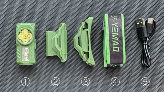 ①ライト本体 ②万能クリップ ③ライトベース ④ヘッドバンド ⑤充電ケーブル