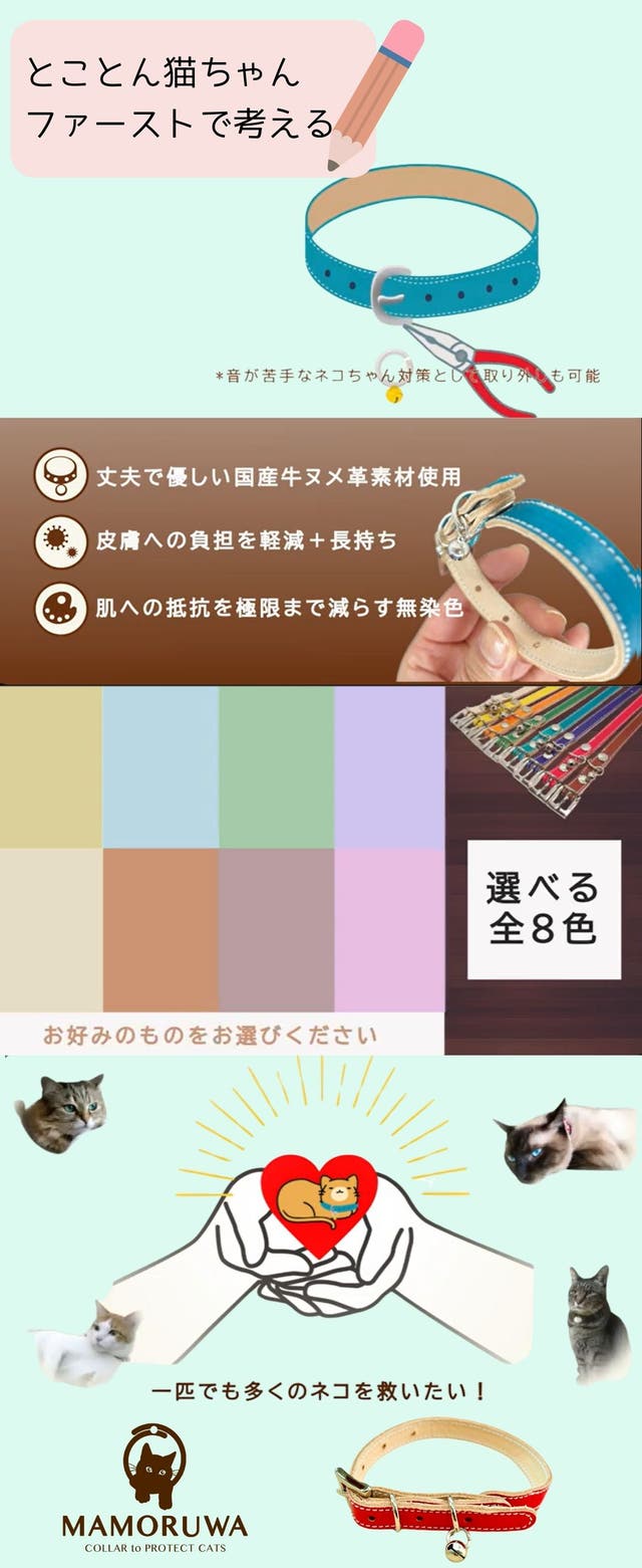 「Makuake(マクアケ)」は、実行者の想いを応援購入によって実現するアタラシイものやサービスのプラットフォームです。このページは、 プロダクトカテゴリの 「愛猫の大切な命を守る首輪【MAMORUWA】猫好きの革職人が本気で作った猫の首輪」プロジェクト詳細ページです。