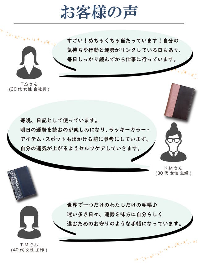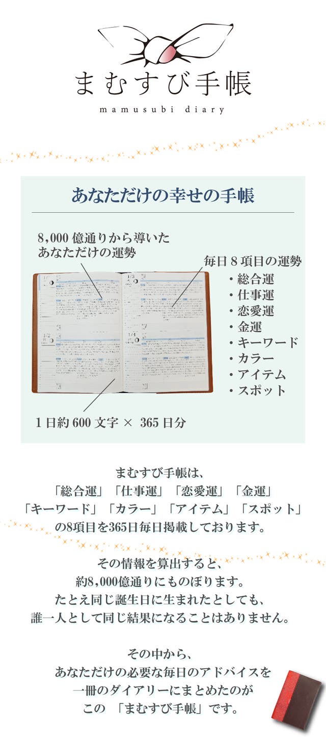 【ご購入の際の注意点 】 まむすび手帳は、一人ひとり内容の異なる“オーダーメイド手帳”のため 作成前にお客様パーソナルデータをいただいております。 応援購入をしていただき代金お支払い後、 Makuakeのダイレクトメッセージ機能(DM)にて 弊社よりパーソナルデータご確認の連絡をさせていただきます。 メッセージ到着から7日以内にご回答をお願いいたします。 ご回答が遅れた場合、手帳の発送が遅れる可能性がございます。 【パーソナルデータ】 (例:真結 太郎さんの場合) 1.生年月日 (1990年1月1日) 2.性別 (男) 3.血液型 (A型) 4.お名前の読み (たろう) 5.出生地 (東京都) 6.手帳に表記する名前(Taro Mamusubi) ・ 画面上の写真と実物では、色や質感が異なって見える場合がありますので、ご了承ください。 ・”月運”のページの運勢内容はすべて共通のものとなります。 ・ プロジェクトページ内記載の内容と異なる事態が発生した際には、活動レポート等で速やかにお伝えいたします。 ・本文中に記載させていただいたスケジュールは、 あくまでプロジェクト公開時点の予定です。 応援購入の性質上、配送遅延のおそれがございます。 原則として、配送遅延に伴う応援購入のキャンセルはできませんが、リターン配送予定月から3ヵ月 を超えた場合には、 希望者に限りキャンセルにて対応させていただきます。